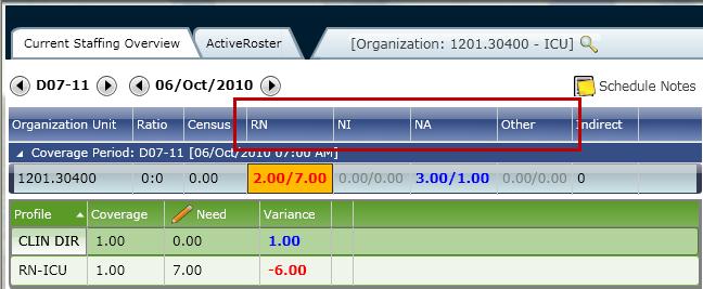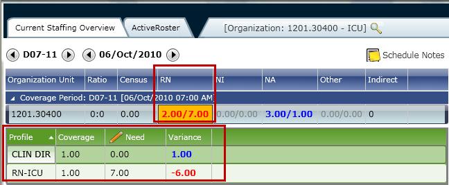 For example, the following image shows two individual profiles (Clin Dir and RN-ICU) and details of the needs. These profiles are combined into an RN profile group with summary information.
