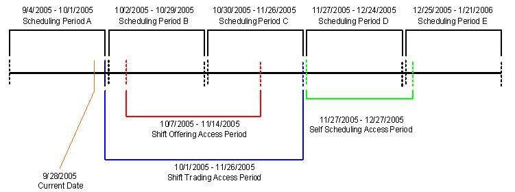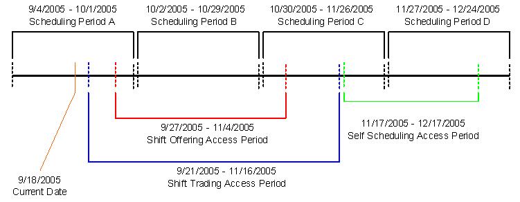 In above scenario, when the Current Date is 9/18/05, the Shift Trading Access Period will be from 9/21/05 until 11/16/05. The Shift Offering Access Period will occur from 9/27/05 through 11/4/05. The Self Scheduling Access Period will be from 11/17/05 until 12/17/05. However, the below diagram displays when these actions are valid due to Schedule Period occurrences.