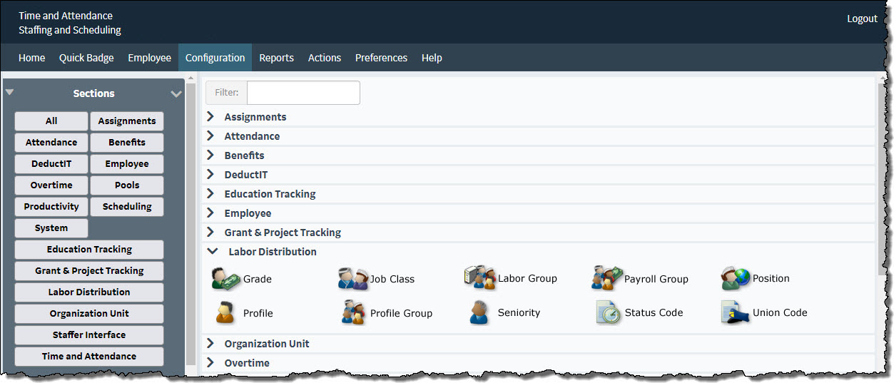 In the following example, the Configuration section was chosen and all the related Configuration card options are displayed. The Labor Distribution card is expanded to view the screen options within that card.